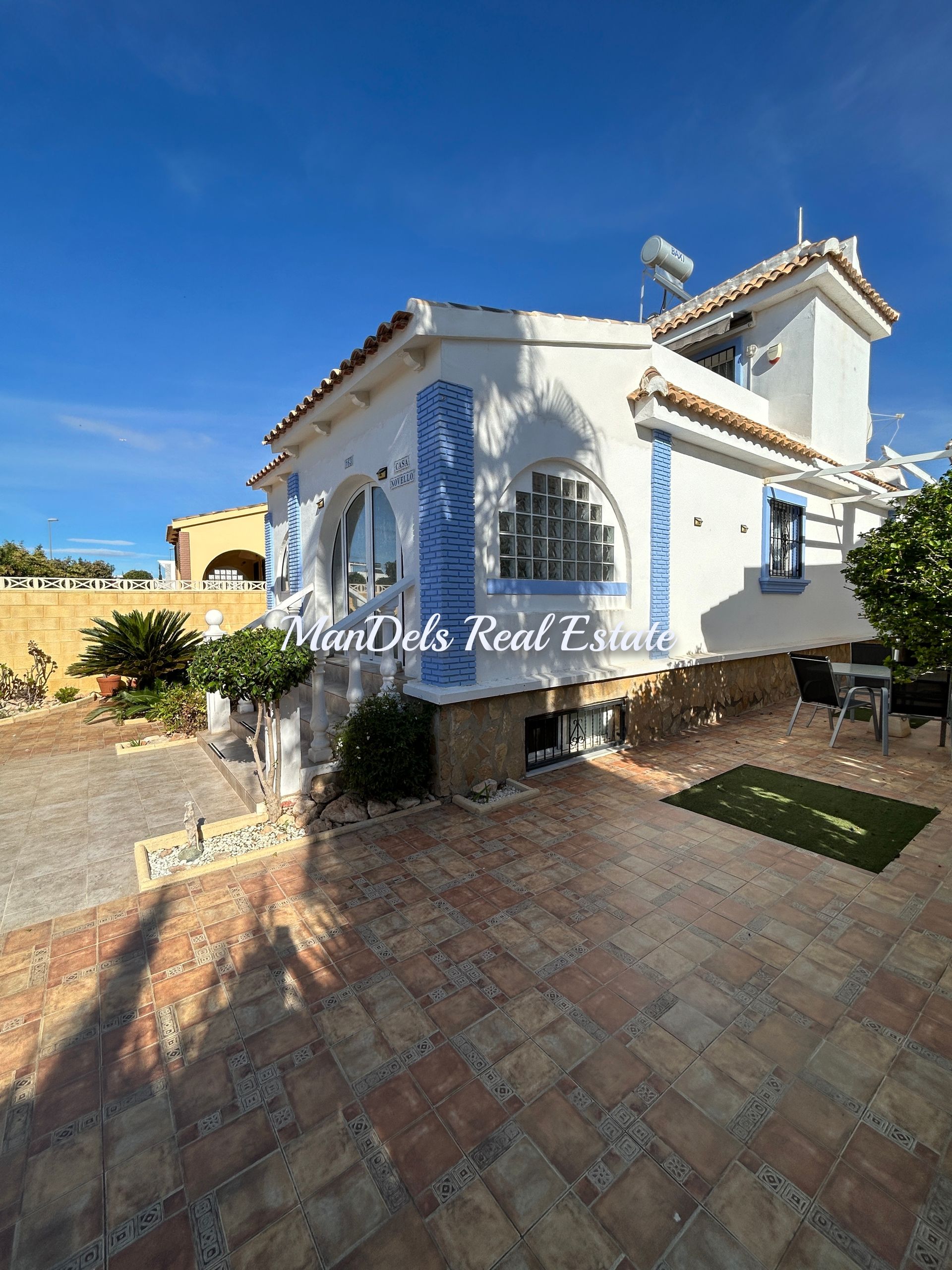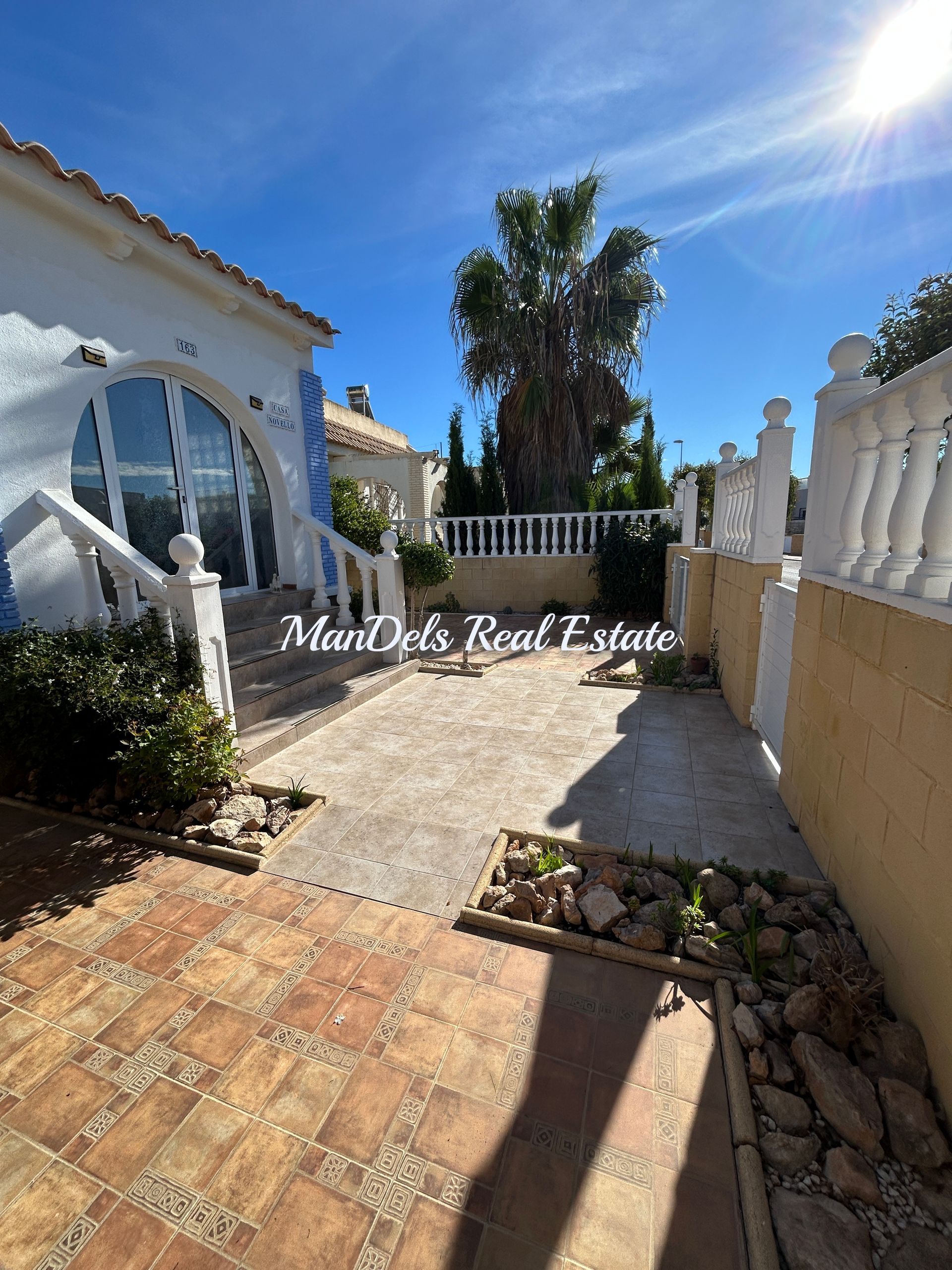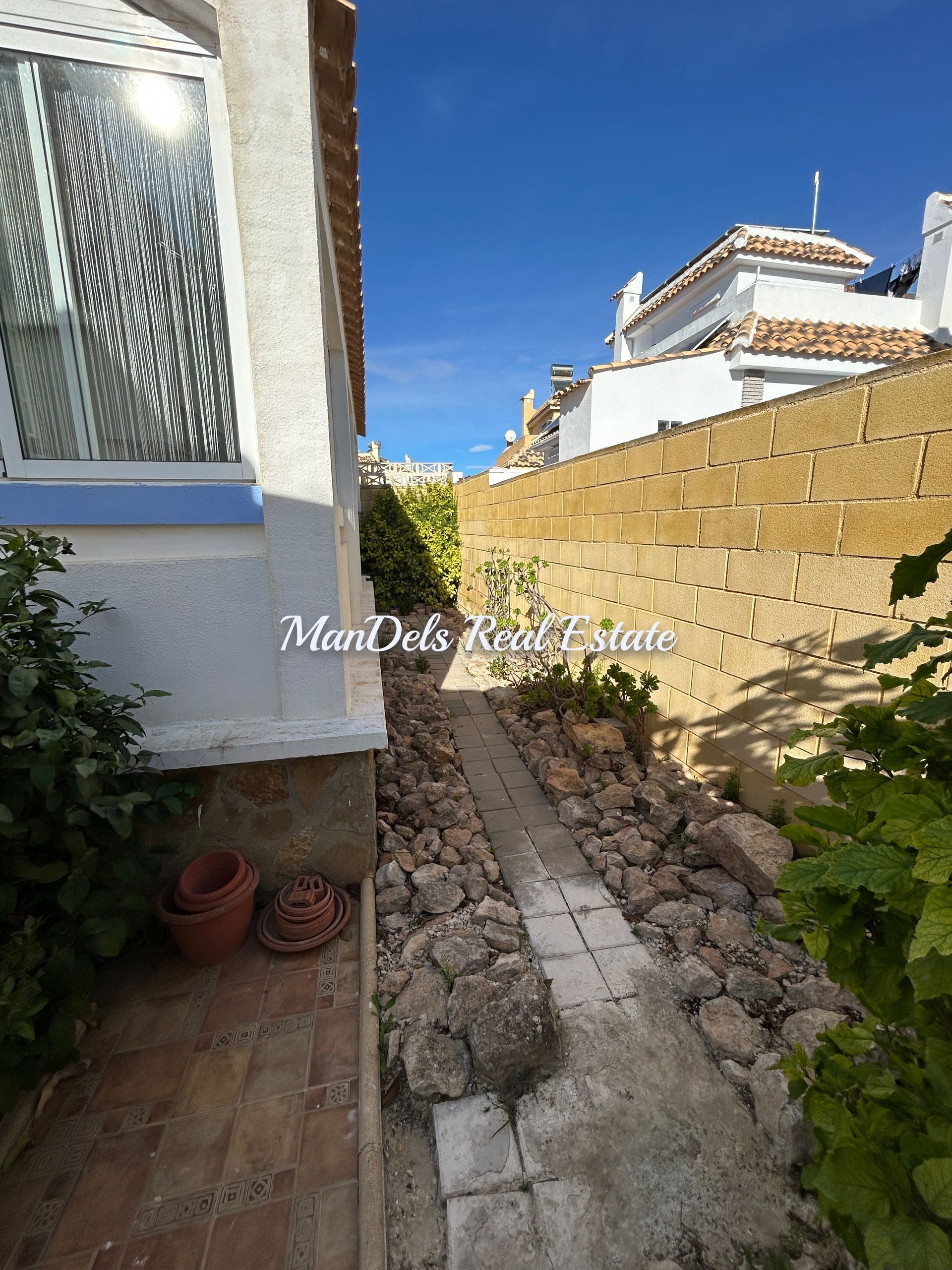 The villa has high walls and a gate for access to off street parking.