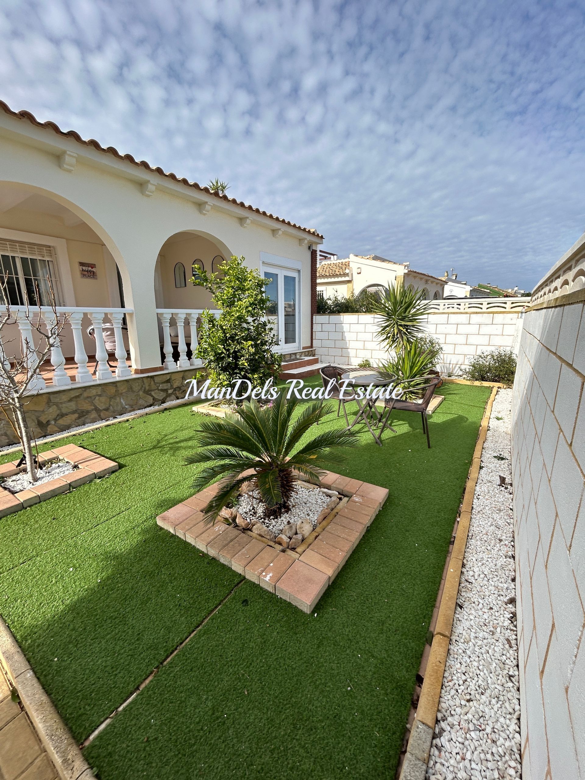 The property is accessed via 4 small steps leading to a covered patio area surrounded