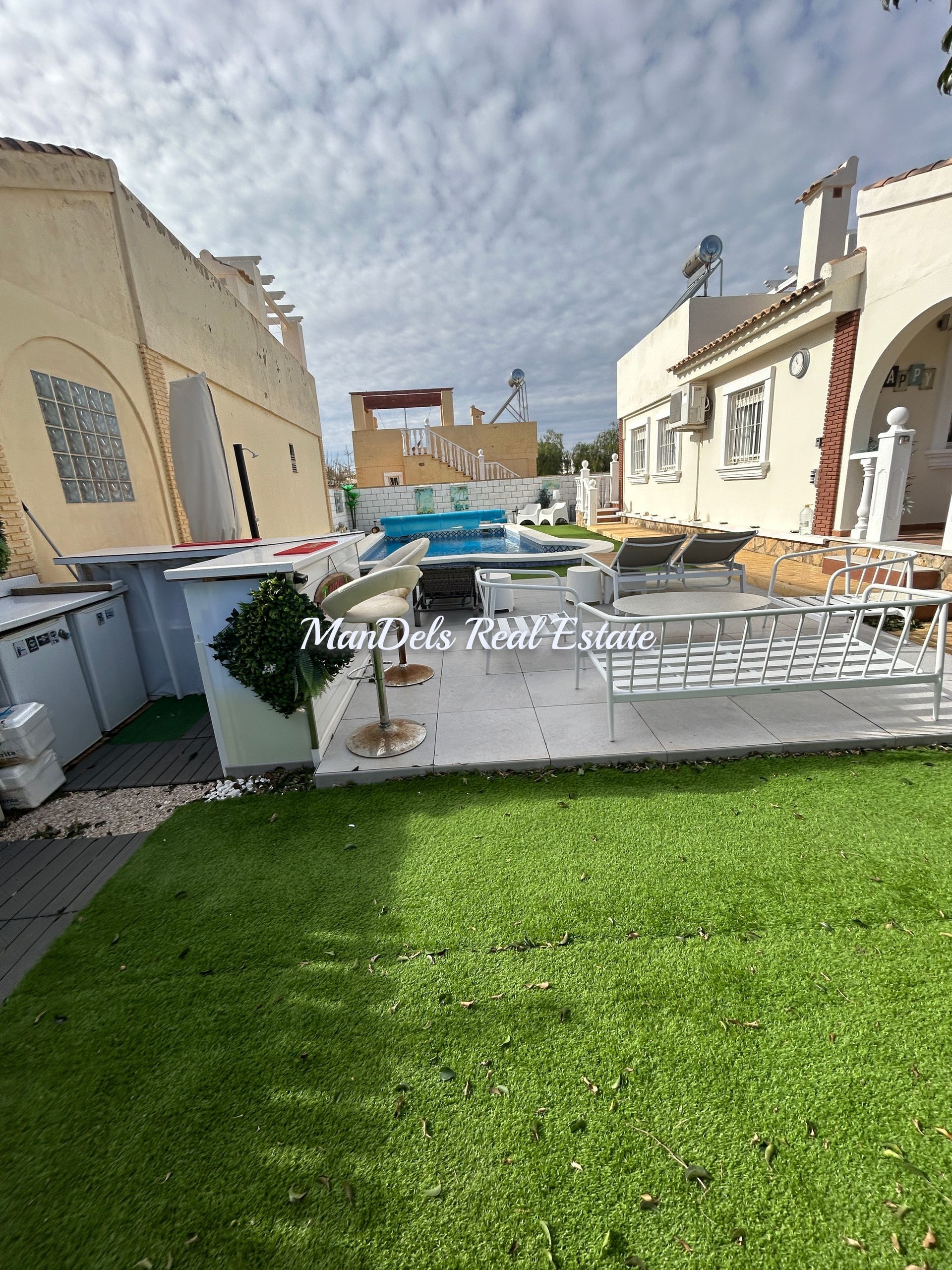 The beautiful 8 x 4 heated pool with summer cover, outdoor shower, seating area and bar are situated to the left of the villa.