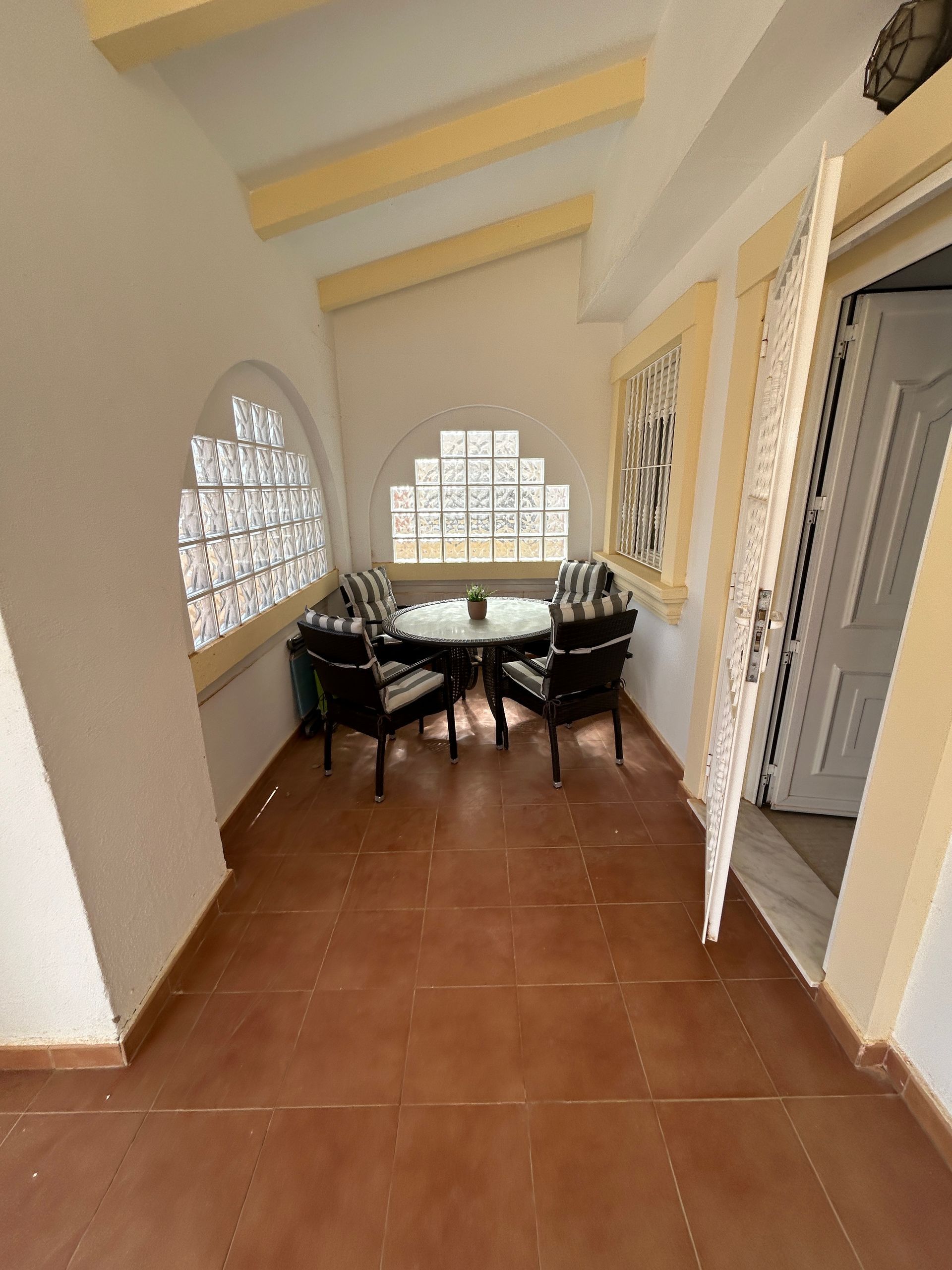 The solarium is in good condition and provides plenty of space for seating to enjoy the great views.