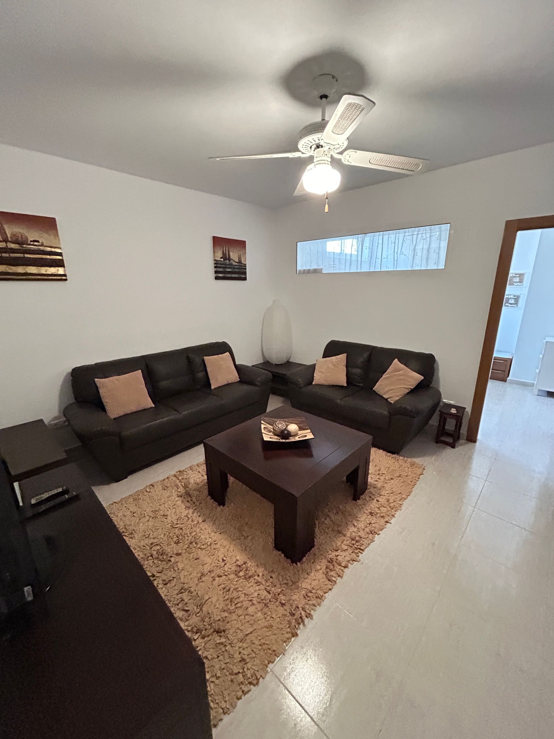 This furnished spacious lounge has a ceiling fan.